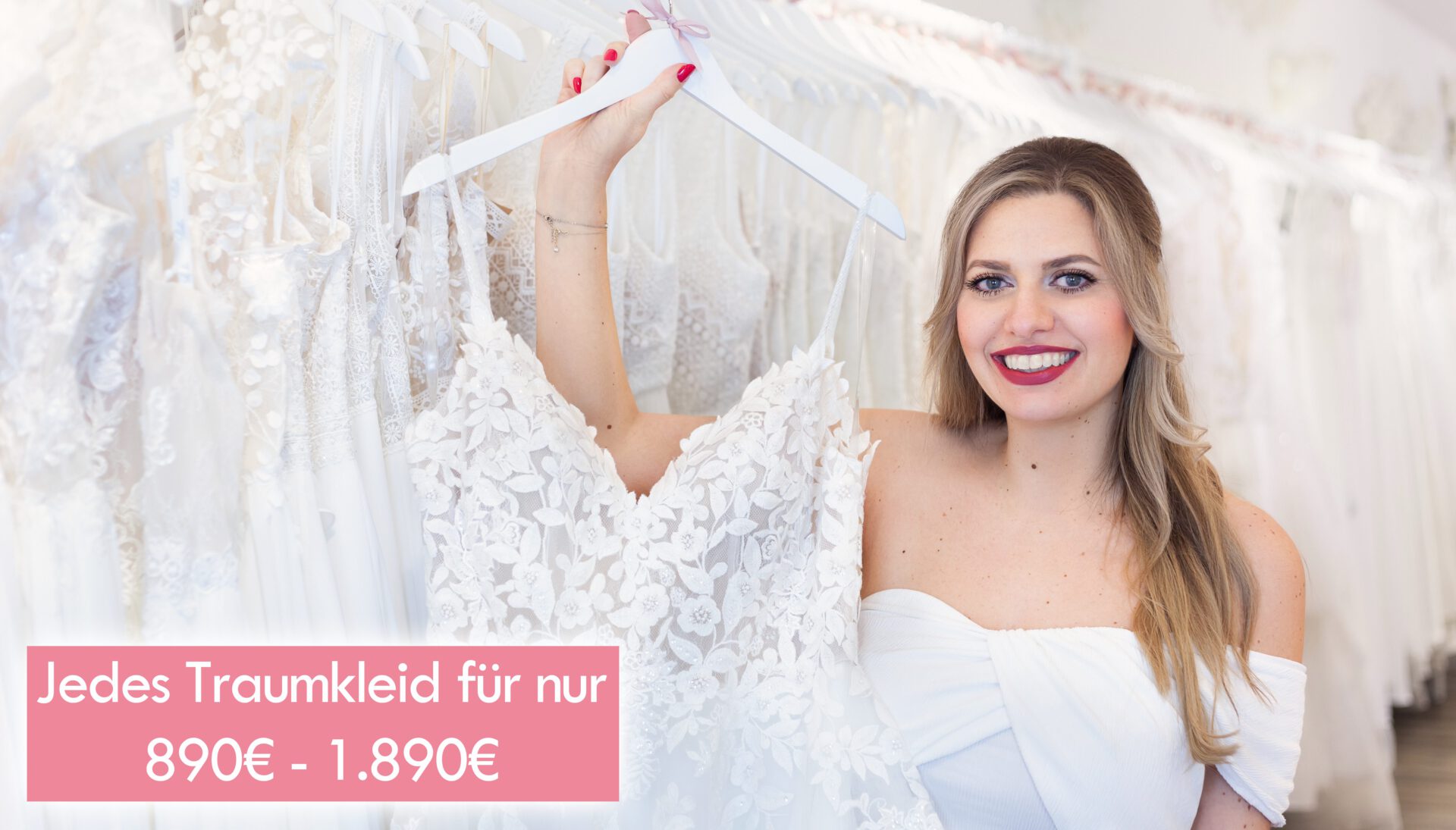 Schönste Designer-Brautkleider zum unschlagbaren Preis: In unserem klimatisierten Brautmodengeschäft findest du aus über 500 neuen Designer-Brautkleidern dein hochwertiges Traumkleid in den Größen 34 bis 52 für nur 890€ bis 1.890€.